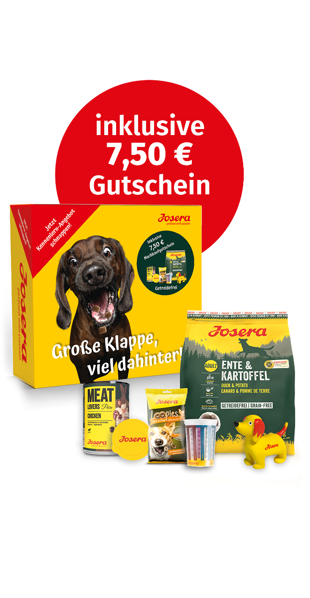 Dein Hund will unseren absoluten Bestseller auch mal ausprobieren? Dann schnappt Euch unser Josera Probierpaket Getreidefrei! Darin findest Du nämlich eine 900 g Probierpackung unseres Ente & Kartoffel Hundefutters mit wertvollem Entenprotein als einzige tierische Proteinquelle. Das ist alles auf einen Blick: 900 g Ente & Kartoffel 400 g Dose Meat Lovers Pure Chicken – inklusive praktischem Dosendeckel 150 g Loopies Leckerchen mit Geflügel einen Messbecher zum perfekten Abmessen der Futterration unseren allseits beliebten Quietsche-Seppl und als Highlight einen 7,50 € Nachkauf-Gutschein! Josera Ente & Kartoffel ist das verträgliche Hundefutter mit schmackhafter Ente als einzige, tierische Proteinquelle und einer Rezeptur ohne Getreide. Biotin und wertvolle Fettsäuren unterstützen zudem schöne Haut und ein glänzendes Fell. Durch die Verarbeitung ausgesuchter Zutaten ist das getreidefreie Hundefutter besonders gut verdaulich.