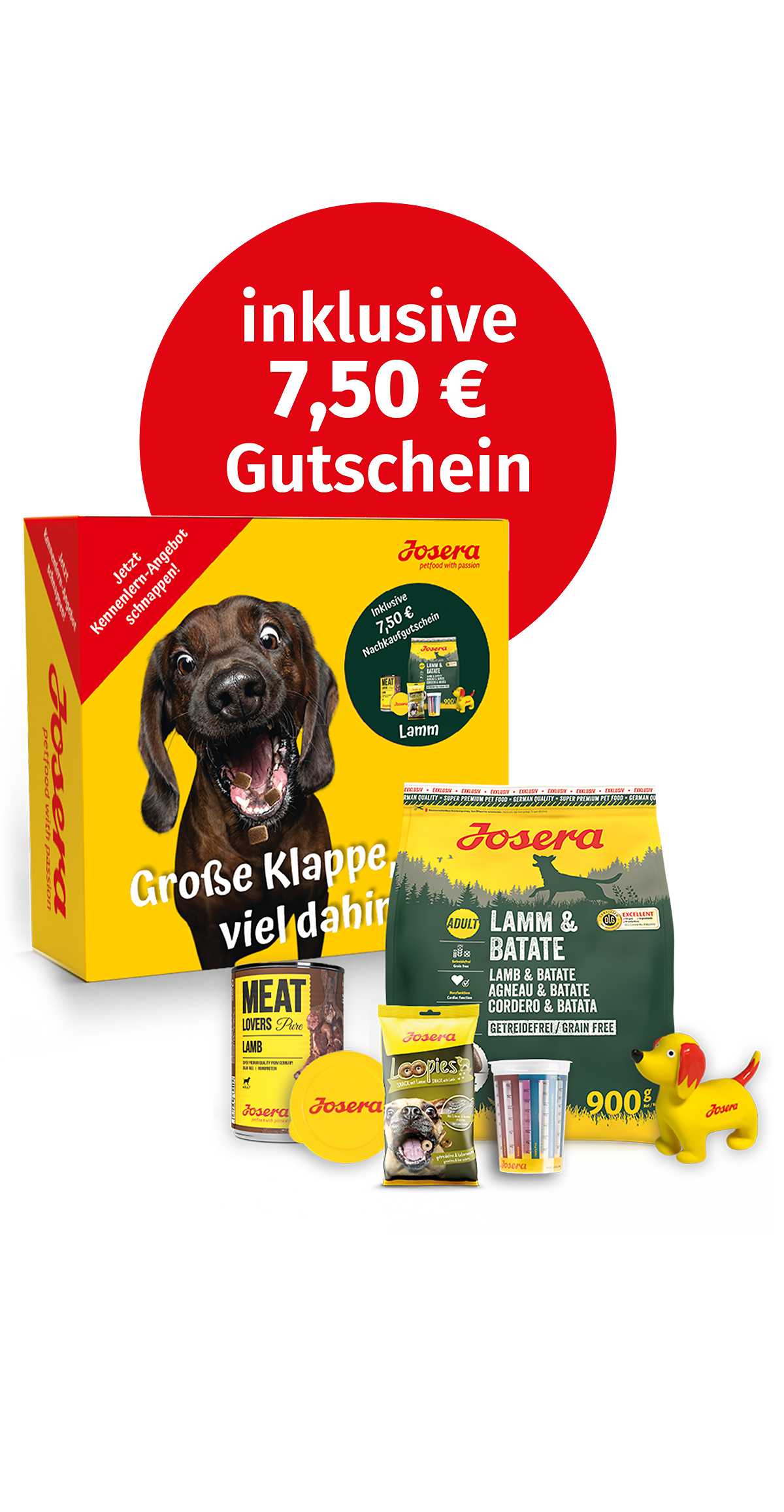 Lammfromm für einen Bissen Josera? Dann probiert doch mal unser Josera Probierpaket Lamm aus! Darin findets Du neben unserem getreidefreien Josera Lamm & Batate Hundefutter weitere Leckereien mit dem unwiderstehlichen Geschmack von Lamm. Das gesamte Paket auf einen Blick: 900 g Lamm & Batate 400 g Meat Lovers Pure Lamb – inklusive praktischem Dosendeckel 150 g Loopies Leckerlis mit Lamm einen Messbecher zum perfekten Abmessen der Futterration unseren allseits beliebten Quietsche-Seppl und als Highlight einen 7,50 € Nachkauf-Gutschein! Josera Lamm & Batate bietet pures Lammvergnügen ohne Getreide, dafür aber mit Kräutern und Früchten. Als wertvolle alternative Energiequelle wird die Rezeptur mit Süßkartoffel abgerundet. Das schmeckt super, ist verträglich und sorgt für Abwechslung im Napf!